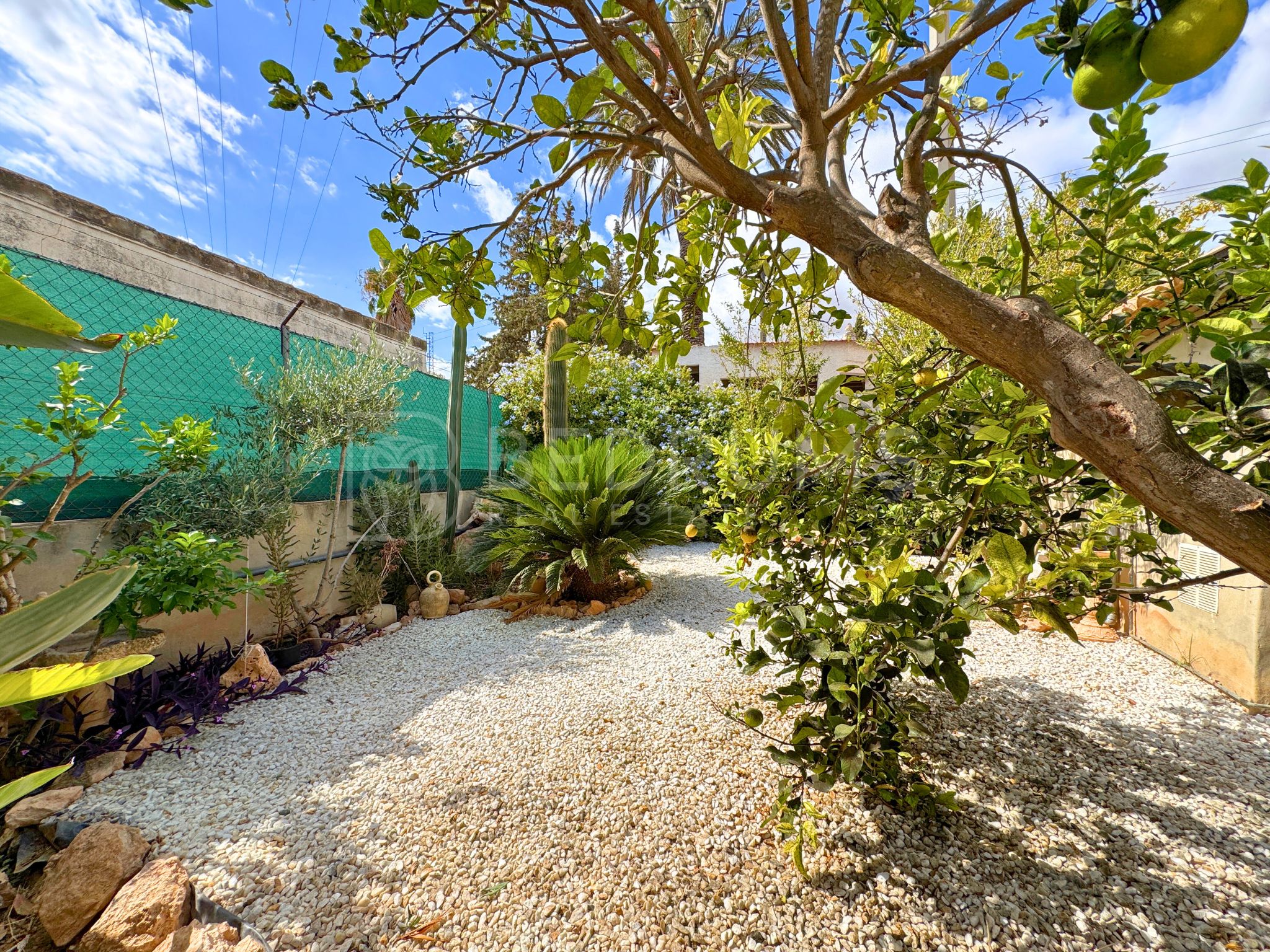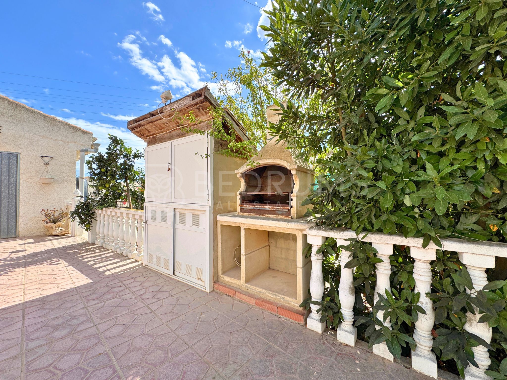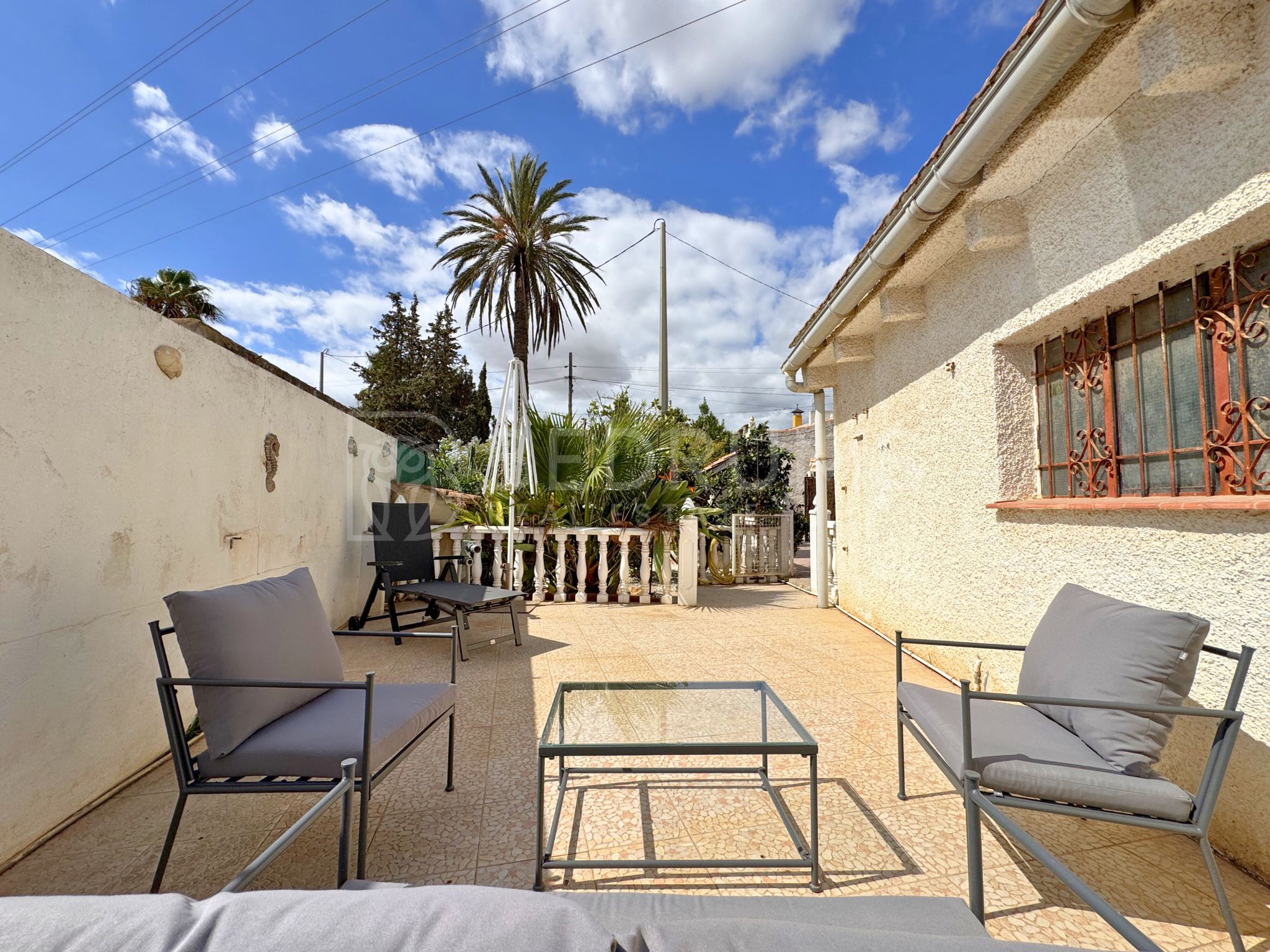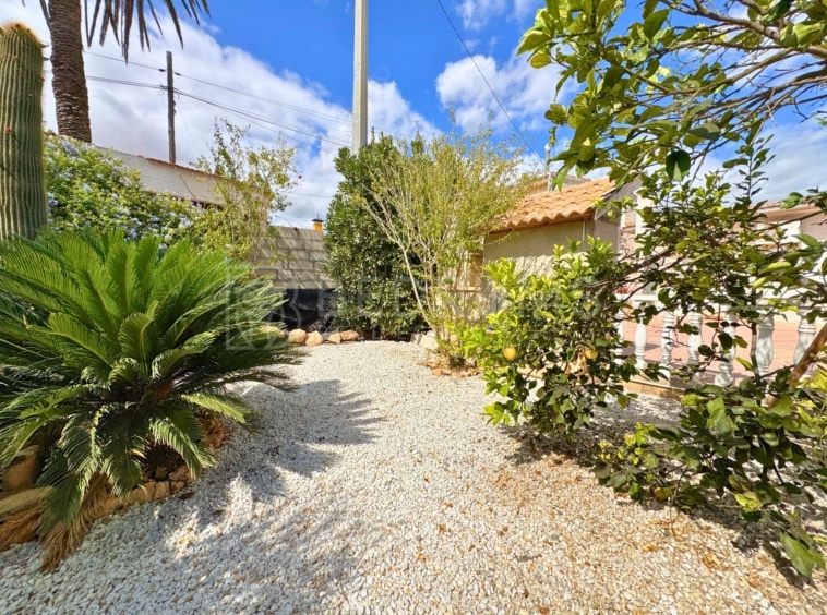 La parcela de 300 m² ofrece distintos espacios al aire libre: un cuidado jardín con diferentes especies, solárium y una amplia terraza con comedor y barbacoa, ideal para compartir momentos en compañía y disfrutar del clima mediterráneo.