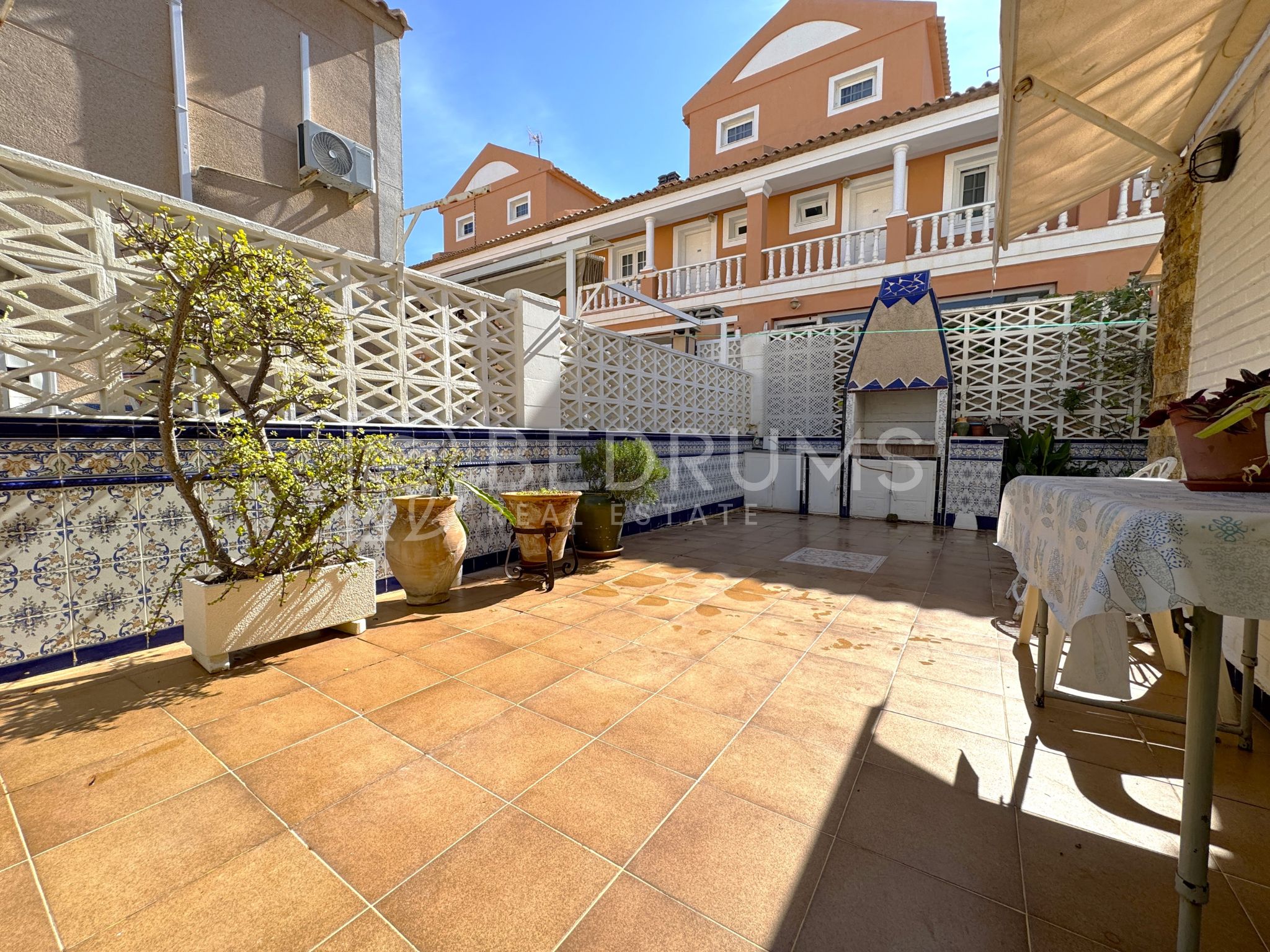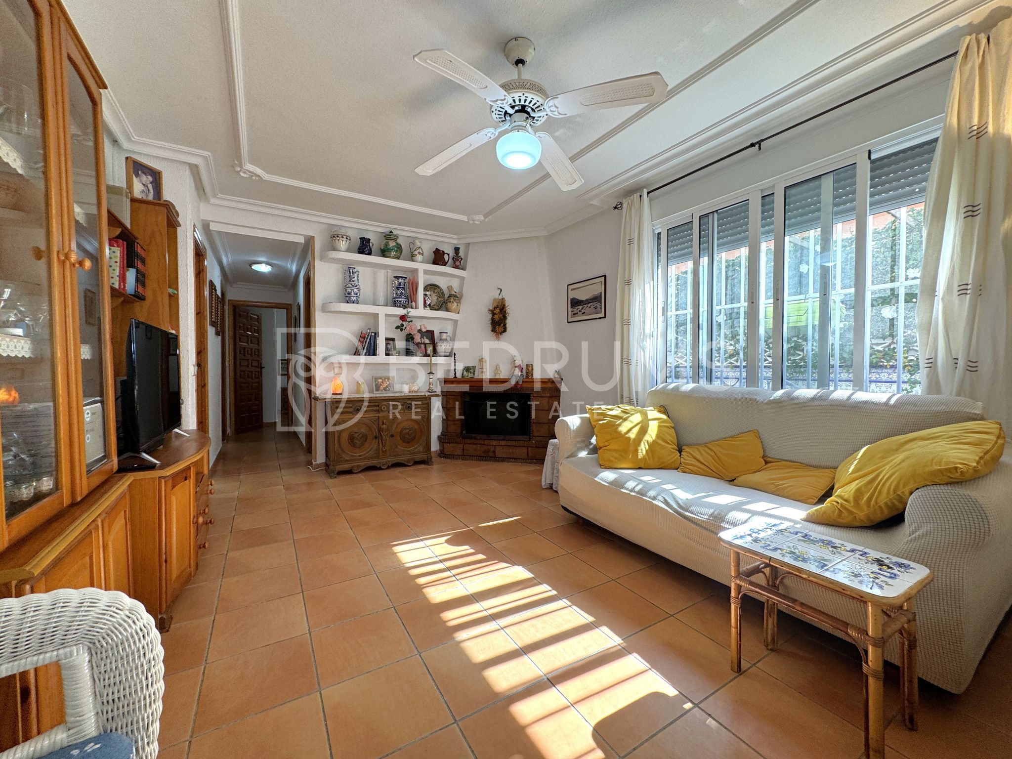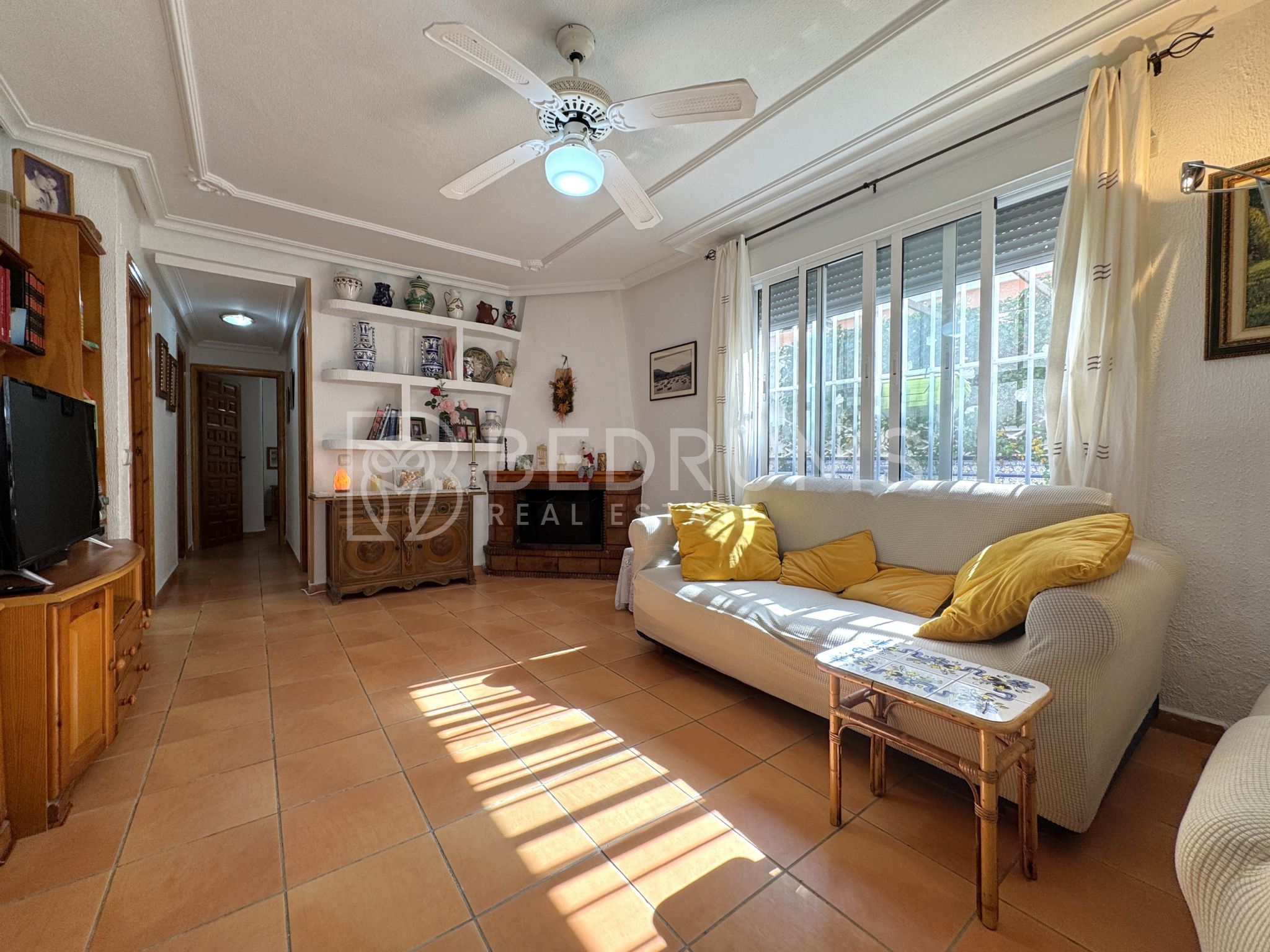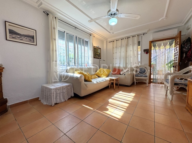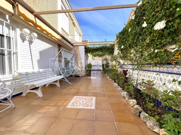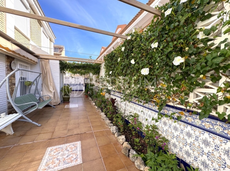 Entre su equipamiento destacan el dormitorio principal con cuarto de baño en suite, cocina totalmente equipada, armarios empotrados, aire acondicionado, chimenea, ventiladores de techo con lámpara, carpintería exterior de aluminio-climalit con rejas metálicas y mosquiteras, así como una estructura exterior con guías y toldos correderos que amplía las opciones de uso de la terraza durante todo el año.