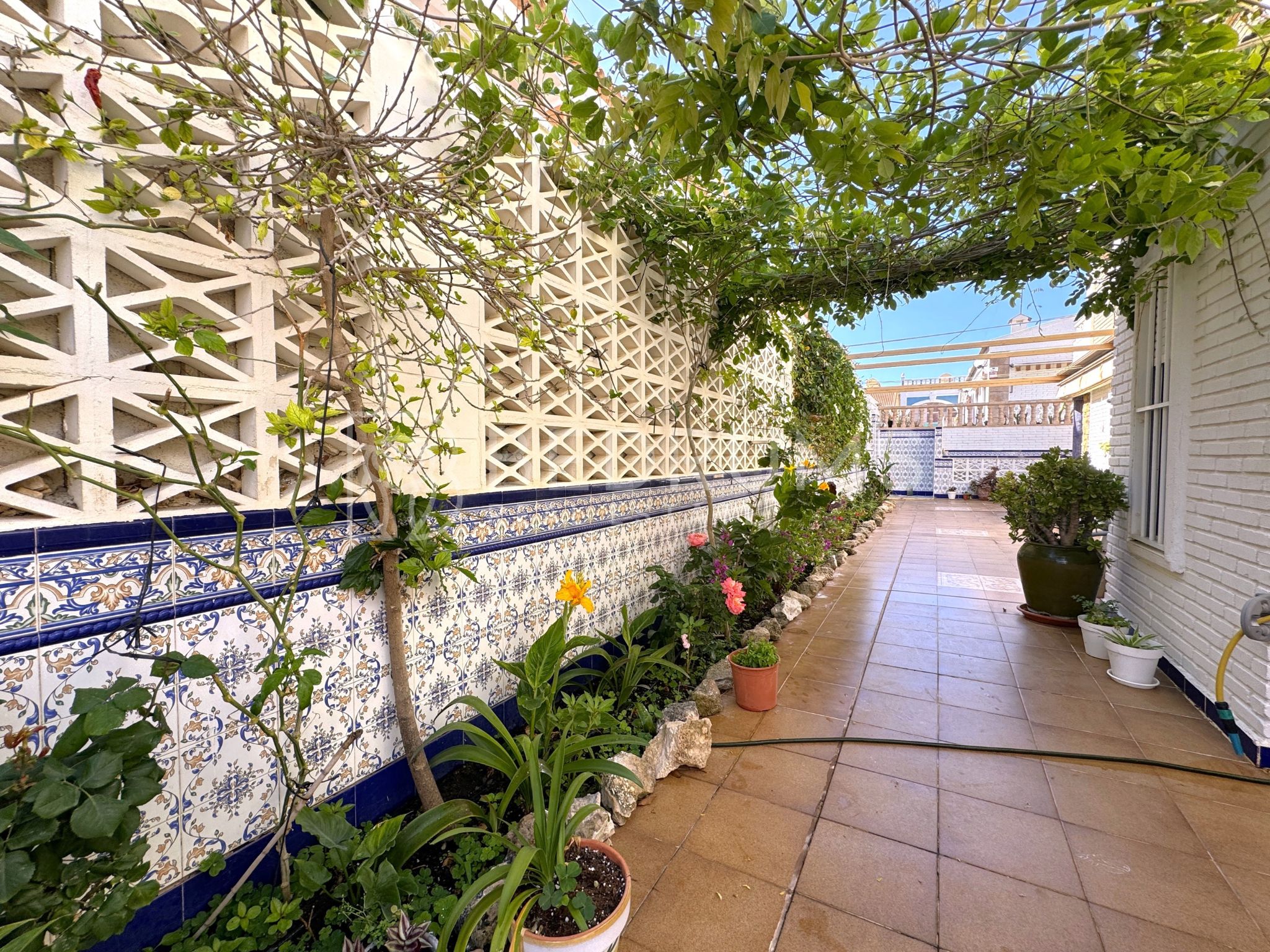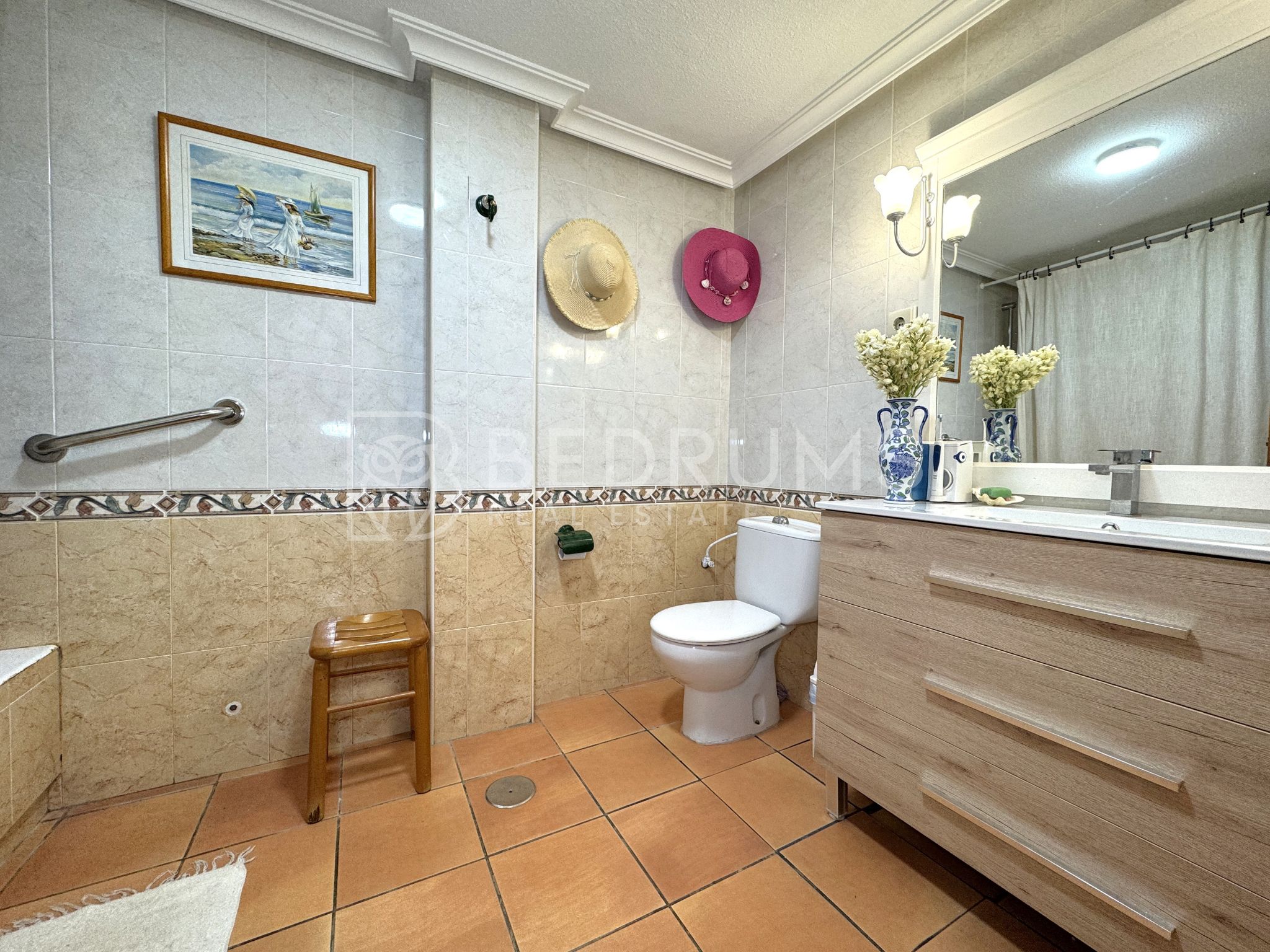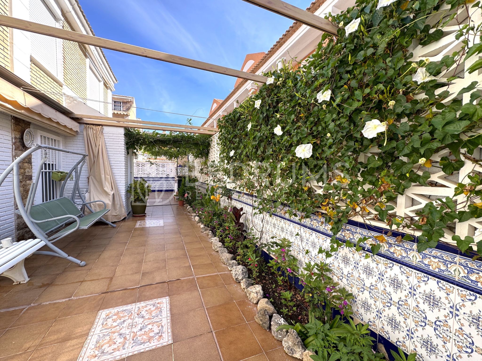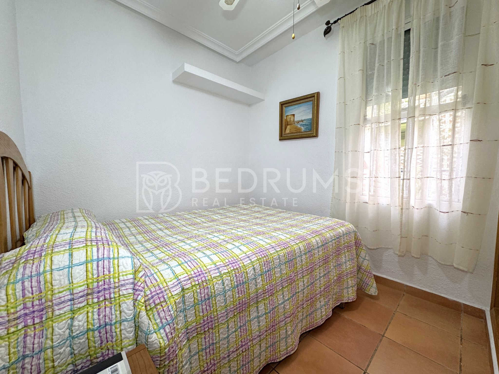 Entre su equipamiento destacan el dormitorio principal con cuarto de baño en suite, cocina totalmente equipada, armarios empotrados, aire acondicionado, chimenea, ventiladores de techo con lámpara, carpintería exterior de aluminio-climalit con rejas metálicas y mosquiteras, así como una estructura exterior con guías y toldos correderos que amplía las opciones de uso de la terraza durante todo el año.